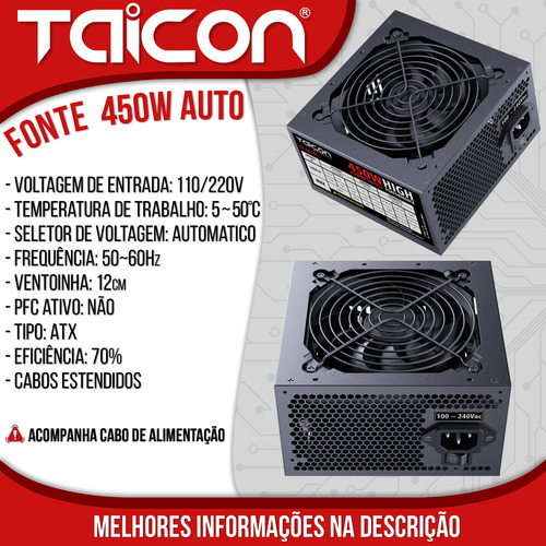 Fonte TAICON 450w Real, automatica, com Flat Black Cables.