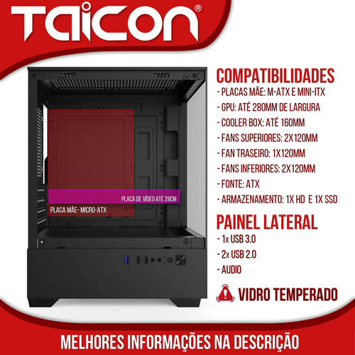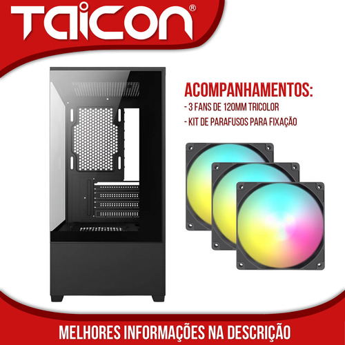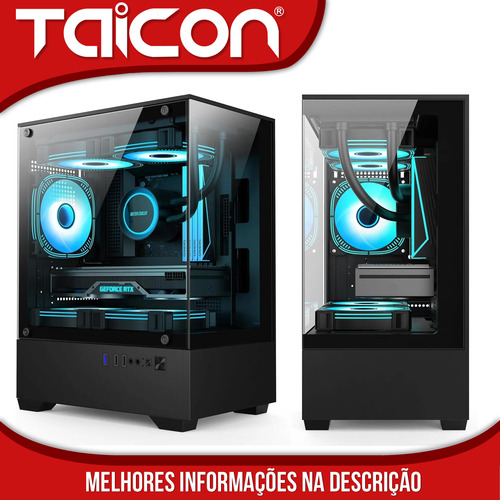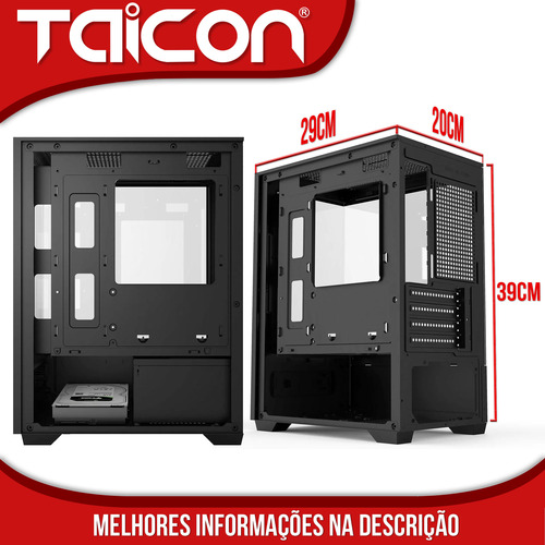O gabinete Ta-Pc800 possui acabamento externo em vidro temperado. Ideal para montar um completo setup gamer/ worker. Flexibilidade na instalação das suas peças e acessórios. Possui espaço para 5 Fans (inclusos). A Fonte será instalada na posição inferior.